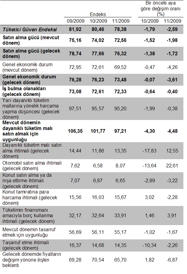Tüketici eğilimine ilişkin soru bazında endeksler